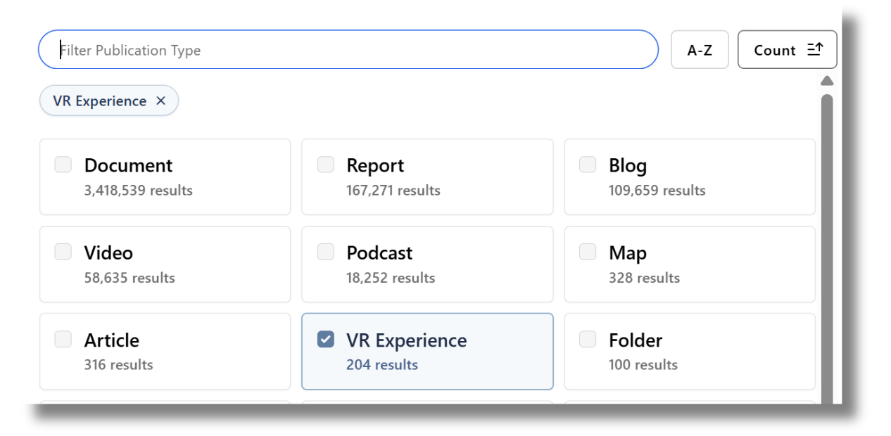Filter by "Publication Type" to view VR experiences in mental health and counseling.